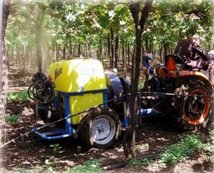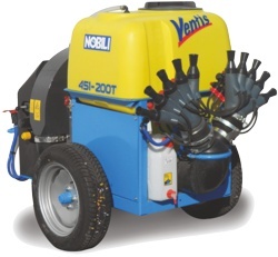 Pneumatic trailed sprayer of very compact size, specifically designed for small tractors. It can be operated also from 24 HP tractors. Equipped with an high efficiency centrifugal fan, it creates an air flow able to ensure an excellent micronization of droplets and the proper spraying penetration also in thick vegetation.Available with a 200 liters tank, fully independent and adjustable Nobili outlets and a centrifugal brass pump (80 l/min).